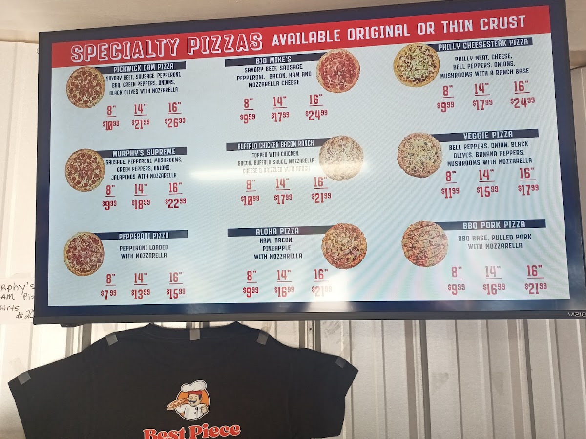 Murphy's Dam Pizza offers a varied and appealing menu, perfect for those craving classic comfort food with a bit of flair. Their Specialty Pizzas are a standout, with the Pickwick Dam Pizza 8" as a delicious option for those looking for a unique taste. Other great choices include the hearty Big Mike's 8", the loaded Murphy's Supreme 8", the zesty Buffalo Chicken Bacon Ranch 8", and the classic Pepperoni Pizza 8", all offering satisfying flavors. For those seeking some extra protein, the Wings come in multiple sizes, including the 6 PCS. Wings, 8 PCS. Wings, 10 PCS. Wings, and the generous 20 PCS. Wings. To complement the meal, the Cheese Bread and Chips are great sides to share, while refreshing 20 oz. Drinks and 2 Liter options ensure you stay hydrated throughout your meal. The menu at Murphy's Dam Pizza offers a comforting mix of familiar favorites, perfect for any occasion.
